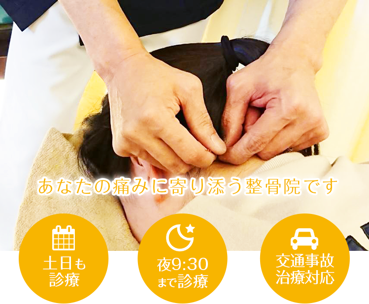 また、交通事故に遭われてしまわれた方も、まず当院に来院いただければ、連携クリニックを紹介いたします。その後も、クリニックの通院と並行して当院に通院いただくことができます。交通事故治療は、お医者様が毎月発行くださる診断書と整骨院の治療内容の一致が非常に重要となりますので、連携の取れた整骨院とクリニックの同時通院を強くお勧めします。